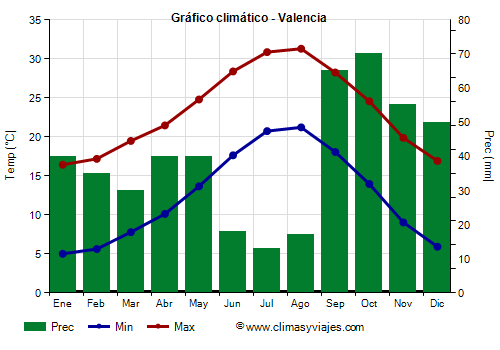 Valencia tiene un clima mediterráneo, caracterizado por veranos secos y cálidos e inviernos suaves y húmedos. La lluvia se distribuye de forma desigual a lo largo del año. Si bien la primavera y el otoño también registran precipitaciones, la mayor parte se concentra en los meses de otoño e inicios del invierno. La sequía estival es una característica muy marcada de esta zona geográfica.