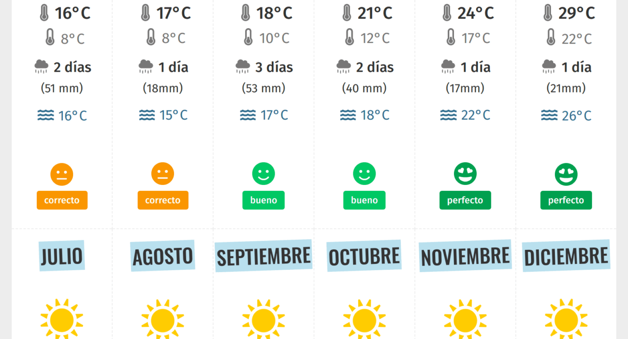 - Verano (junio-agosto): Temperaturas altas, incluso superiores a 30°C. Recomendable para disfrutar de las playas y piscinas, pero con precaución por el calor.
